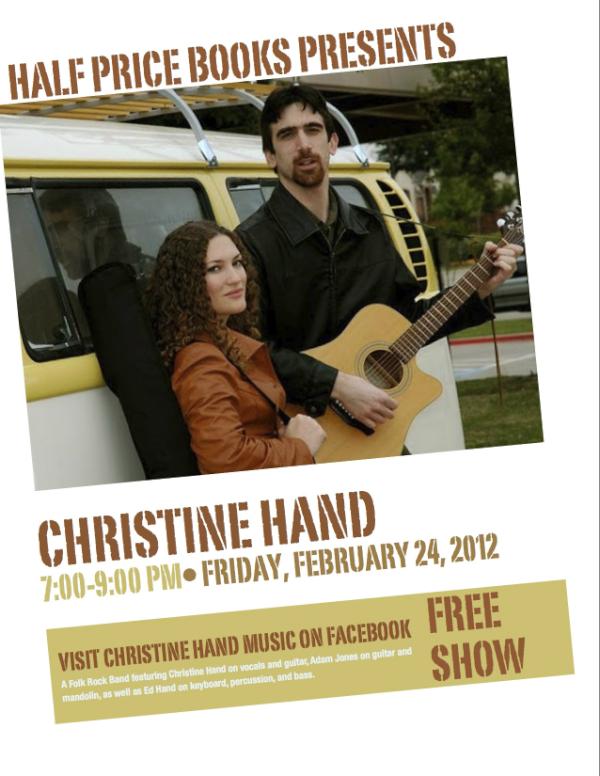 That’s why, I’m pleased to share with the world, the first musician booked at Half Price Books Humble, is Christine Hand. Although Christine has been in the same pocket of friends and social circles as me since I was eighteen, the truth behind why I booked her his pure pleasure and nostalgia. Christine was the one who serenaded me the most often. When I think back on all those evenings at coffee shops, I hear two voices: Christine Hand and David Ramirez.