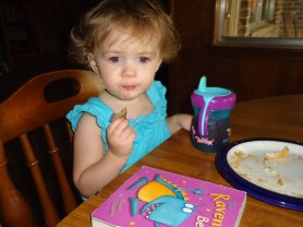 I originally bought The Ravenous Beast for the color scheme (its cover is purple, turquoise, and an orangy- yellow) and illustrations. And the fact that Ayla fell in love with it in the bookstore. That was a while back, and now our once new board book is chaffed, worn, and has a cracked spine. Sharkey’s book has become one of her favorites. It gets read at the table during lunch (my favorite time to read it), at night before bed from time to time, and every once in a while I read it at Half Price Books’ story time while the kids chow down on crackers.