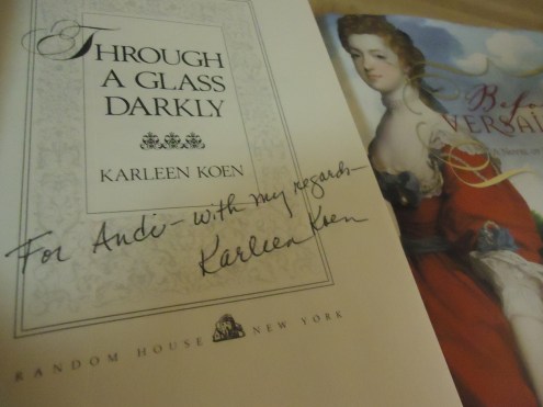 As a reader with severe extrovert tendencies, I will tell you that it is incredibly exciting. Meeting an author, whether you love everything they’ve ever done, or just barely opened the first page of a book, or have never heard of them – to me – is so very exciting. I want to hear their voice and the way they talk, let their real voice intertwine a bit with the inner one I’ve imagined in my head. I want to know a few factoids, a few mannerisms, put their work in a greater perspective. Yesterday, when I met Karleen Koen for the first time, I just wanted to bask in her author-ness, in her bookishness. Of course, I ended up chattering hopelessly because that’s what I do, but my oh my how awesome it was to hang out and listen. It made me want to get home afterward as quickly as possible and finish reading the book that I had meant to finish before the signing. It made me want to buy the other books she has written, and all I can think about this morning is that there is a signed copy of Now Face to Face in hardback sitting on the shelf at the store… and how it needs to be mine.