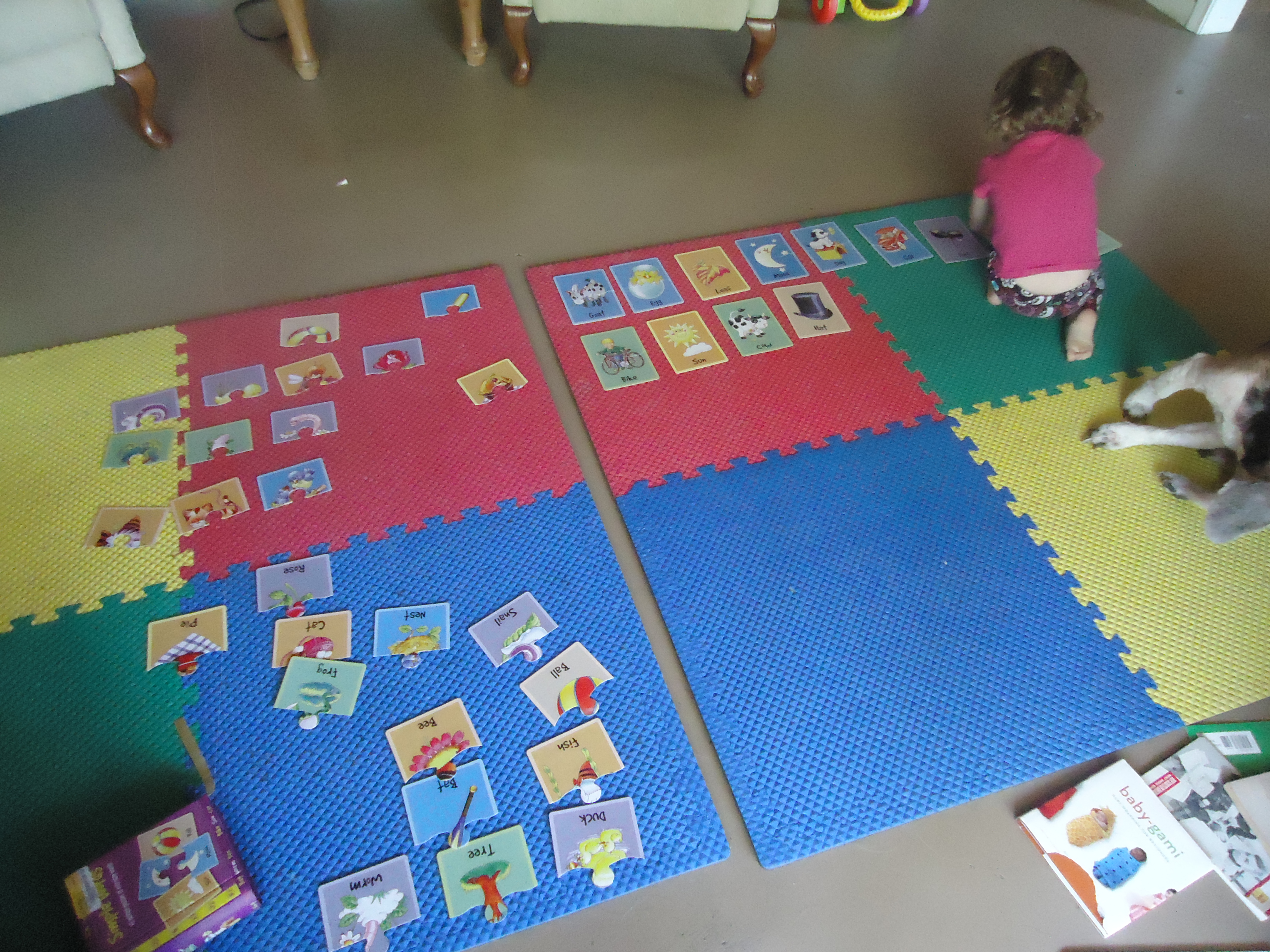She loves to play cards… these are first word matching puzzle cards. The nice, straight rows are all her doing. She’s quite the neat-nick.