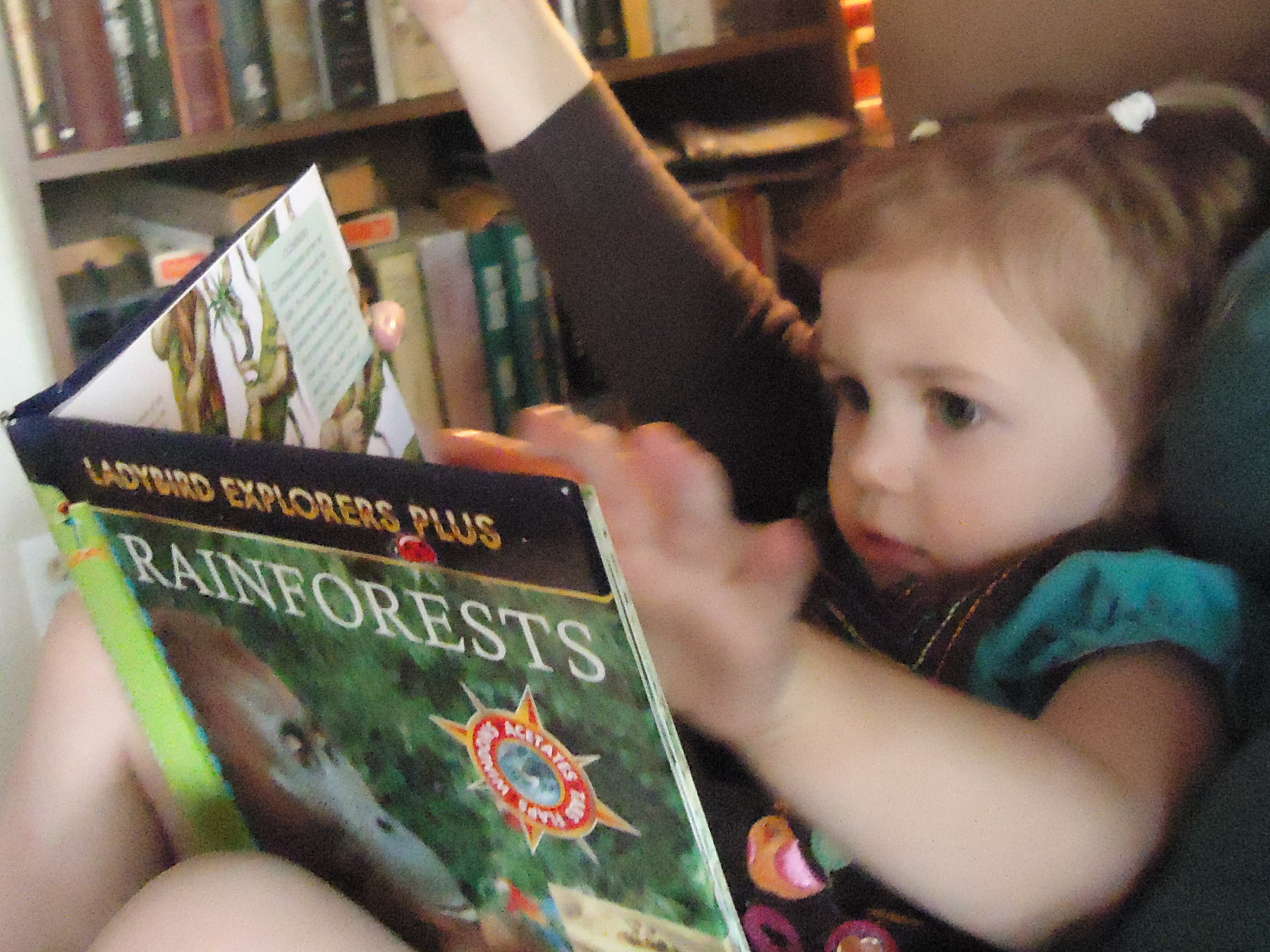 The Ladybird Explorers Plus series are flip/tab books with tons of information. They are great book to have if you have lots of different ages in the house. Even though I can’t say that from the experience of having lots of various aged children, I can say it from the experience of being just as fascinated by this book as my toddler. The pictures are lovely, the facts surprising (I didn’t know there were dolphins in the Amazon River, they must have skipped over that in my childhood rainforest studies), and the tabs and flaps were fun. One of our favorite tabs makes an Asian elephant move a heavy log. Another causes the monkeys to swing through the trees. It includes detailed but simple charts with flaps that show the water cycle in a rain forest, and clear glossy photos that overlap pages like you would find for an overhead projector. The chapter “Beauty in the Forest” lives up to its name and is indeed full of very beautiful illustrations of the trees, birds, and flowers.