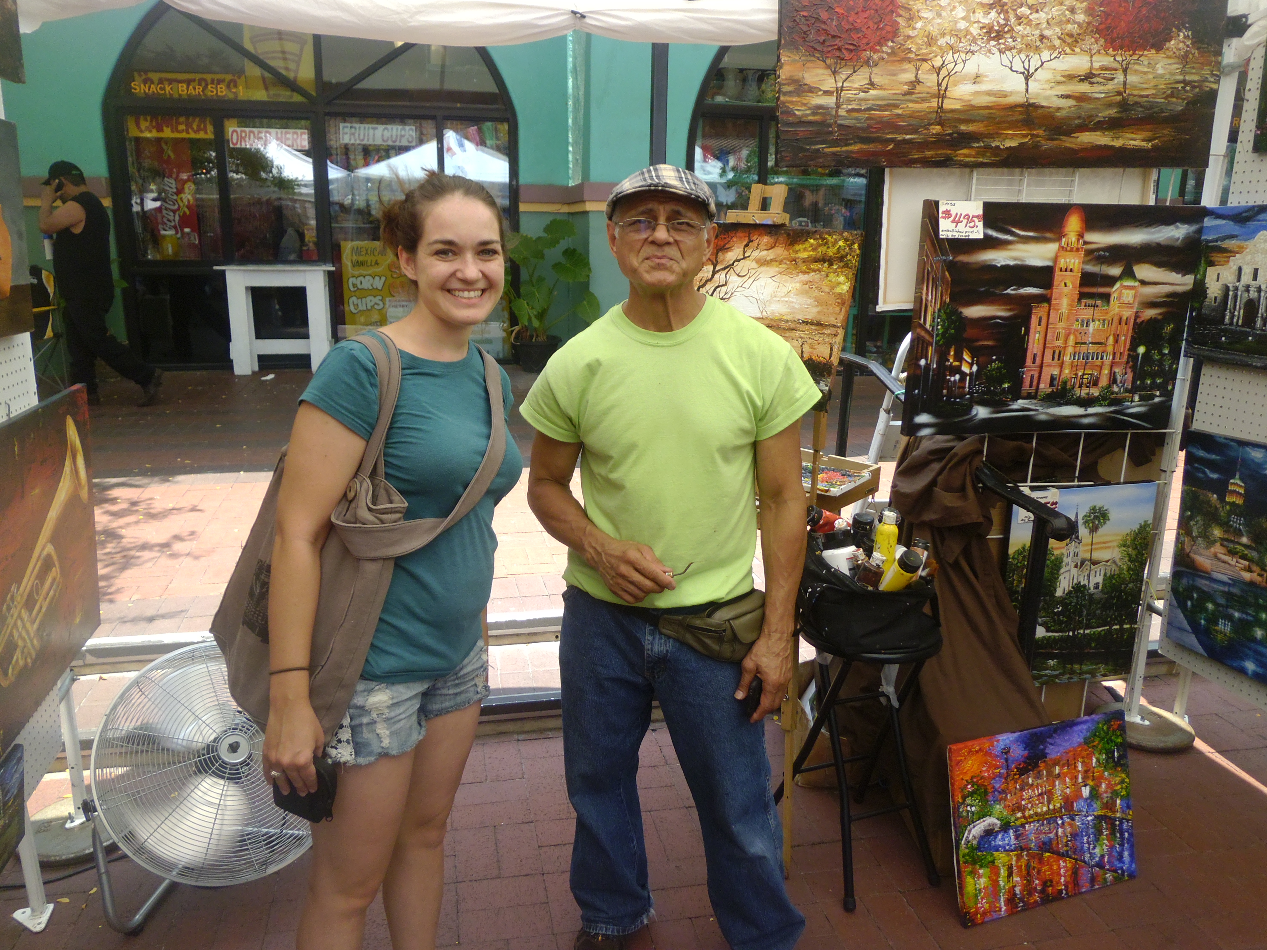 His paintings are affordable for the art collector. Good size canvases that I’ve seen sell in the thousands by less talented painters were running between $400 – $500. You could buy a very small canvas for $25 and walk away with an original piece. His prints were what would hit your pocket, averaging at half the price of the canvas. Seeing that I opted to save for an original Hernandez, rather than buying a print. I took a business card, but came back later to take this picture with him: