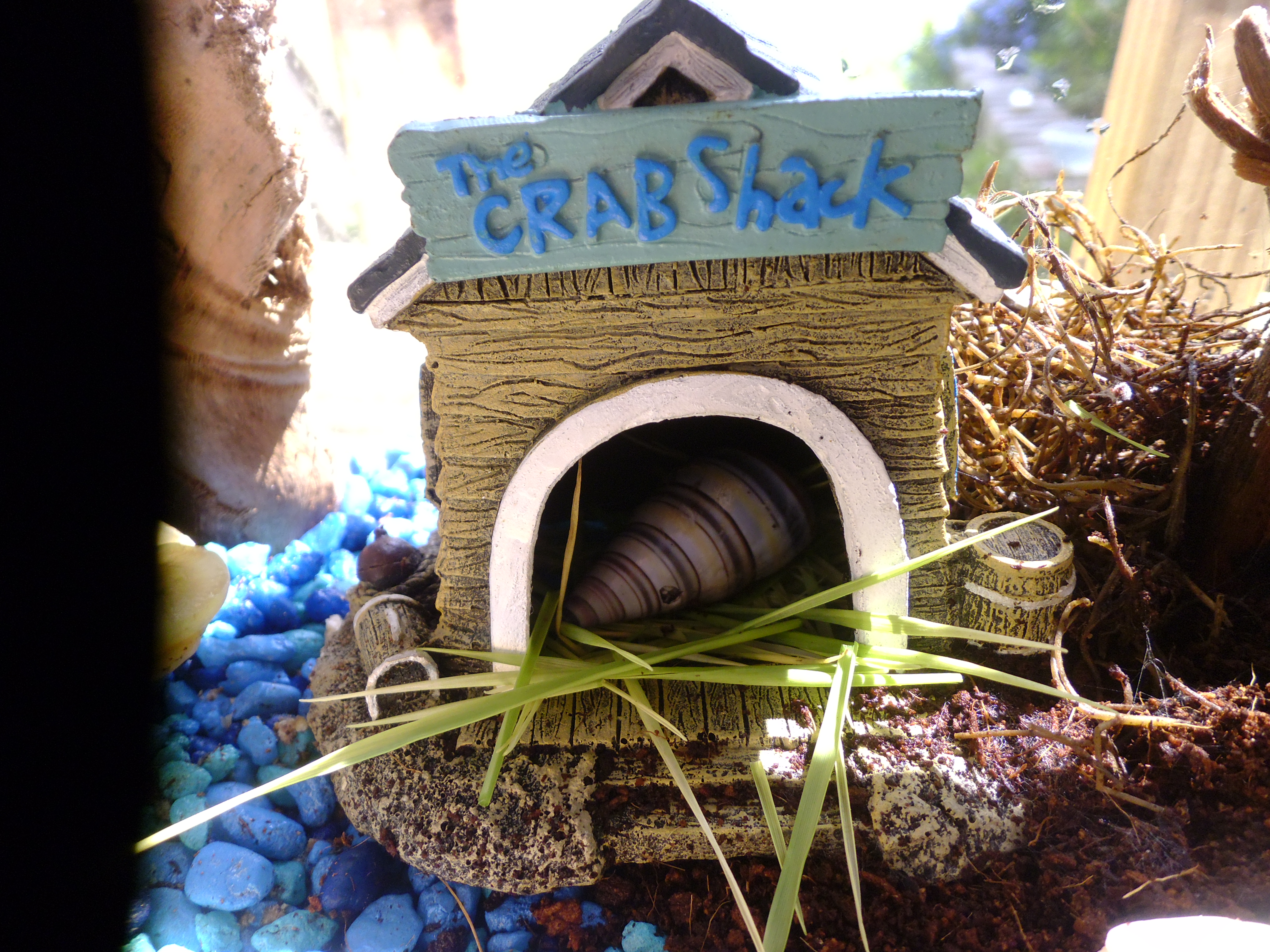 ‘t supposed to have gravel in the tank. They don’t like gravel. They like soil substrate. They like to bury themselves. Not just like, they NEED. Hermit crabs molt and to do so, you need 6 inches of soil for them to dive into. Also, they’re climbers. They want tree limbs. Also, each crab needs its own hiding place, so one crab shack won’t cut it. They want to live together but need their own bedrooms. Who knew?