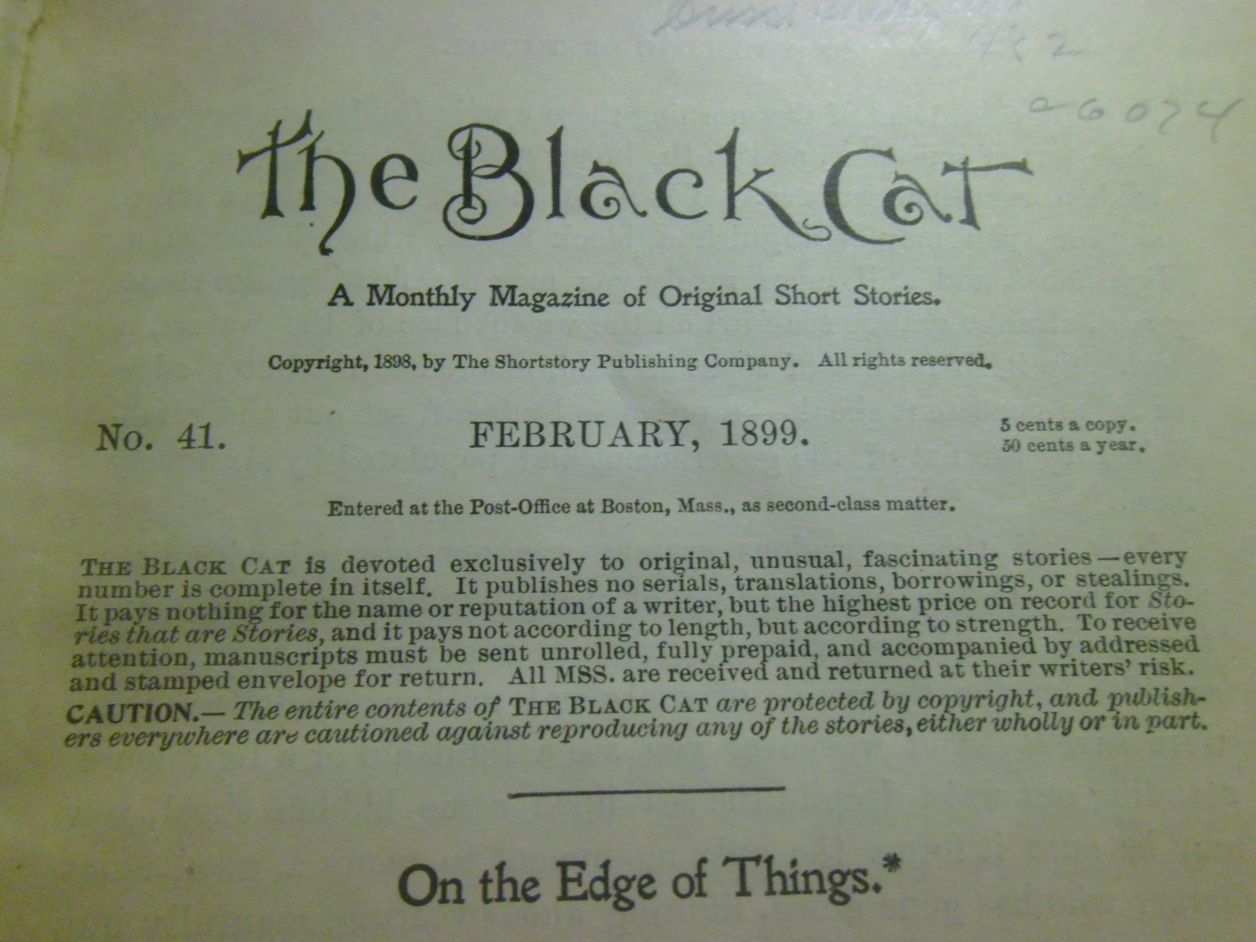 “The Black Cat” is a short story by Edgar Allen Poe, originally published in The Saturday Evening Post in 1843 – it was a horror piece about a murderer similar to The Tell-Tale Heart. It’s no wonder that in 1895, a literary journal called The Black Cat was born, dedicating itself to short stories of an “unusual nature.” Of course, I don’t know for sure that the founders of The Black Cat were referencing Poe, but I can’t help but jump to that conclusion. It’s something I would do.