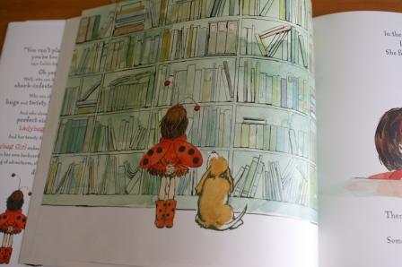 The first time I saw Ladybug Girl by David Somer and Jacky Davis, I fell in love. It was long before I’d even thought about having a kid, but I wanted an excuse to buy it. Not that I had a kid in order to buy kid’s books – I definitely did NOT do that! But the moment I found out I was pregnant, I purchased a copy. The reason I fell in love is because the story is about a little girl that frolics around in a ladybug costume with her faithful hound Bingo, and the first book includes a fabulous page where she and her hound stand in front of a wall of glorious books. Its wonderful. I wanted the illustration framed on my wall.