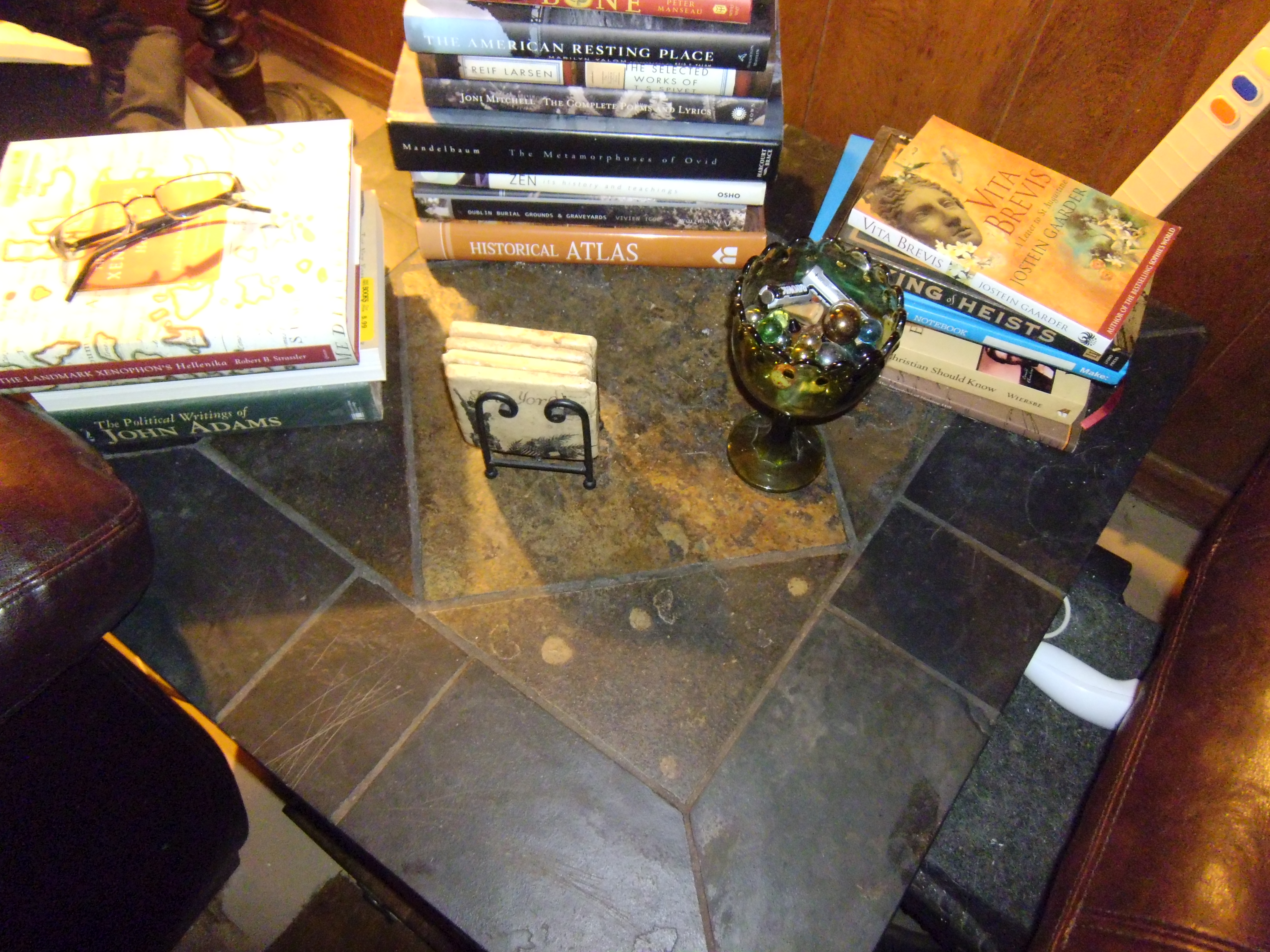 I had not noticed until my husband pointed it out. I had not noticed because it was so familiar. I had not noticed because I live with these stacks of souls trapped in bindings all over my house. Sitting at the kitchen table, watching the sun come up with my coffee, I look out at my table… just here, in the kitchen of all places, I have 10 books, a journal, and a day planner, piled around me. You’d think this was a proper writing desk except for the bowl of orange slices and blueberries, my daughter’s play dough bucket, a United States place mat, and a container of markers.